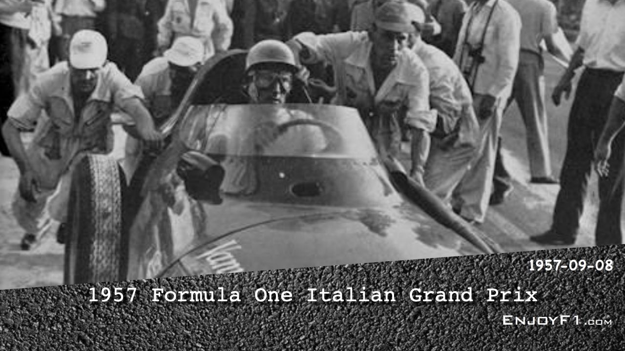 The Italian Grand Prix at Monza was held only on the road circuit without the poorly constructed concrete banking this year, as it had caused problems for the Italian constructors the year before. The track used was very like the Monza of today, although without the chicanes. Ferrari was back in action for this most important of Italian races after boycotting Pescara and so it was a three-way fight between the Lancia-Ferraris, the Maseratis and the Vanwalls. The British cars were strong with pole position going to Stuart Lewis-Evans with Stirling Moss and Tony Brooks alongside him. Juan Manuel Fangio put his Maserati on the outside of the 4-3-4 grid while his teammates Jean Behra and Harry Schell shared row two with Peter Collins's Lancia-Ferrari. There were three more of the cars on row three with Wolfgang von Trips, Luigi Musso and Mike Hawthorn alongside the Scuderia Centro Sud Maserati of Masten Gregory.