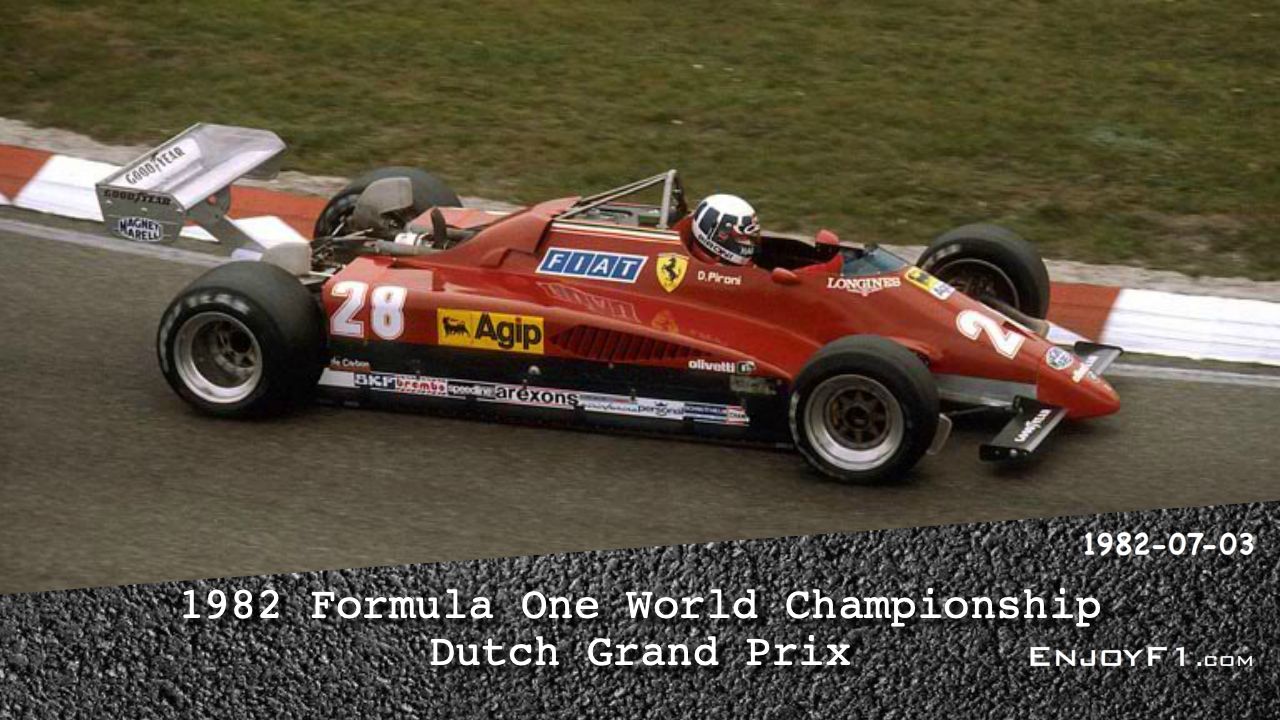 The 1982 Dutch Grand Prix was a Formula One motor race held at Zandvoort on 3 July 1982. The race was the ninth race of the 1982 Formula One season and was won by Didier Pironi, driving a Ferrari, with Nelson Piquet second in a Brabham-BMW and Keke Rosberg third in a Williams-Ford.