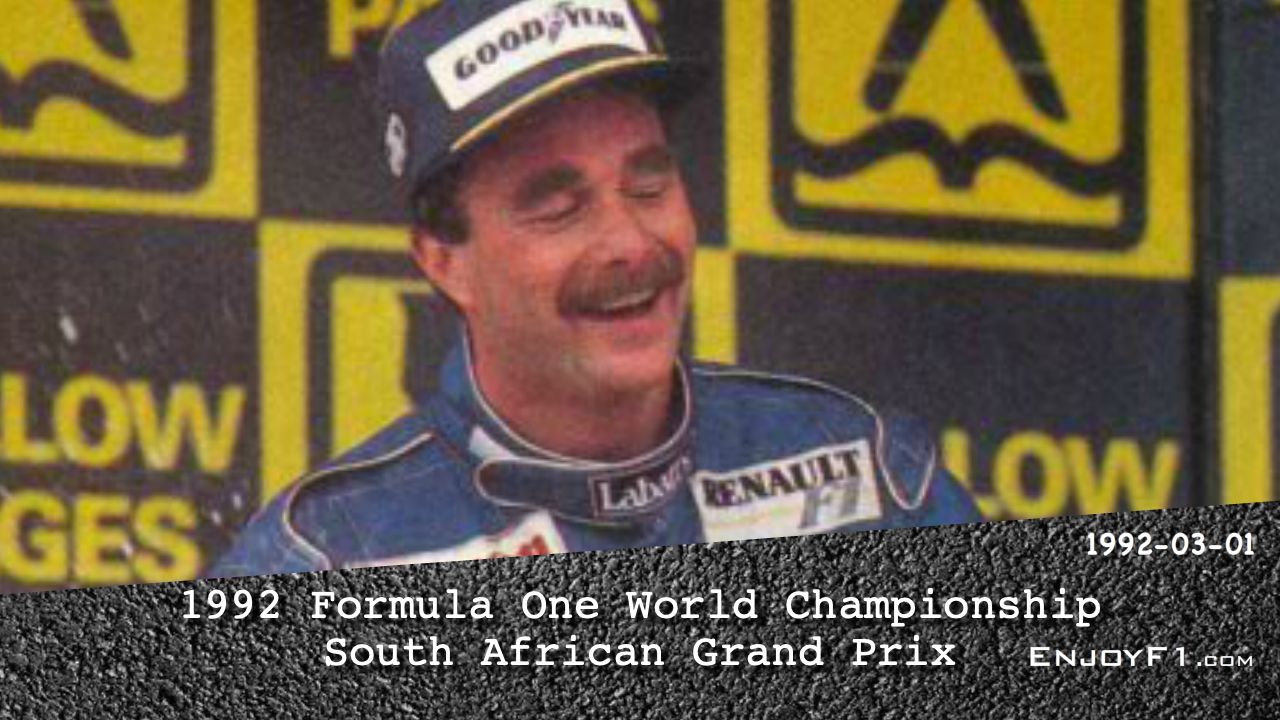 The 1992 South African Grand Prix was a Formula One motor race held at the Kyalami circuit in Midrand on 1 March 1992. It was the opening round of the 1992 Formula One World Championship. Nigel Mansell dominated the weekend in his Williams-Renault, taking pole position, fastest lap and leading every lap of the race en route to victory for the second time in his career. Mansell's teammate, Riccardo Patrese, asserted the dominance of the car by completing a 1–2 finish. Ayrton Senna completed the podium for the McLaren team.