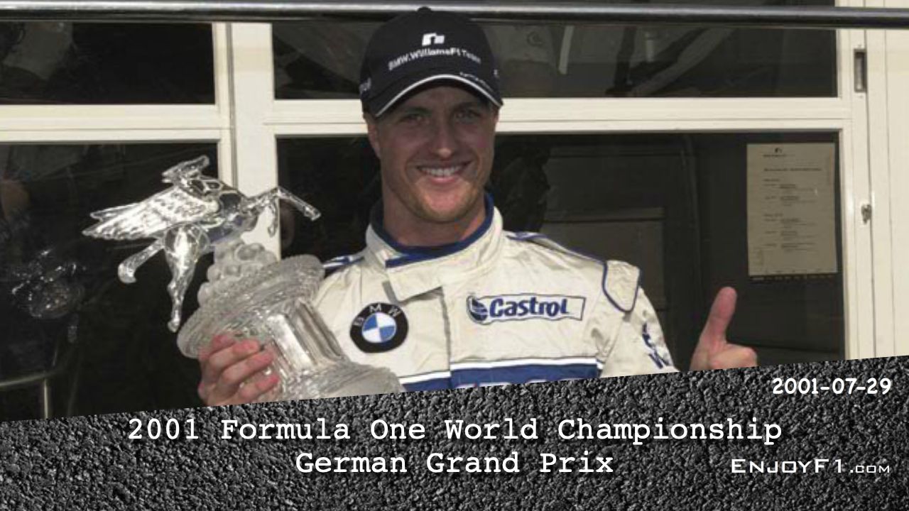 The 2001 German Grand Prix was a Formula One motor race held on 29 July 2001 at the Hockenheimring in Baden-Württemberg. It was the 12th round of the 2001 Formula One World Championship. Williams driver Ralf Schumacher won the race starting from second. Rubens Barrichello finished second for Ferrari with BAR driver Jacques Villeneuve third scoring his last F1 podium finish.