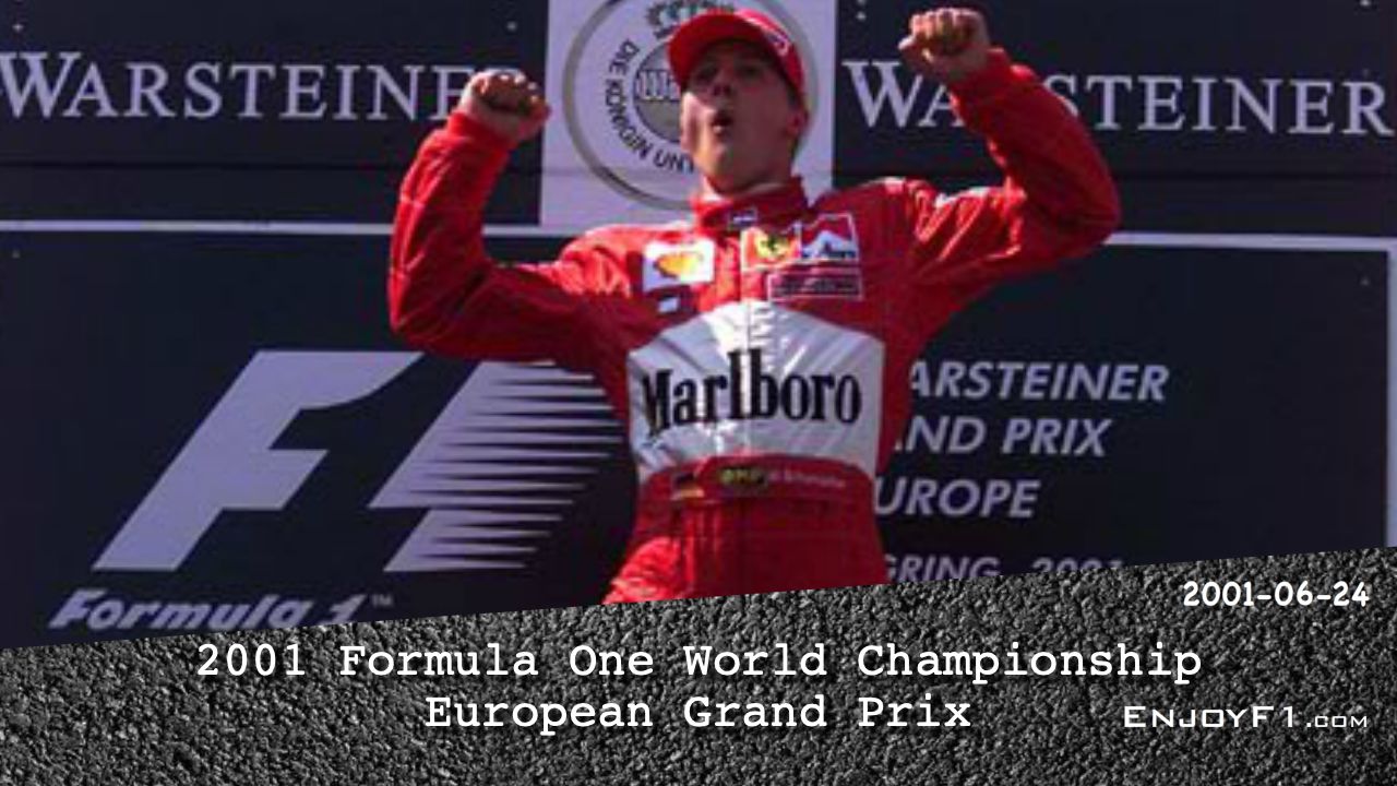 The 2001 European Grand Prix was a Formula One motor race held on 24 June 2001 at the Nürburgring, Nürburg, Rhineland-Palatinate. It was the ninth race of the 2001 Formula One World Championship. It was also the last race on this layout until the track was modified in 2002. Ferrari driver Michael Schumacher won the race from pole position. Williams's Juan Pablo Montoya finished second and McLaren's David Coulthard was third.