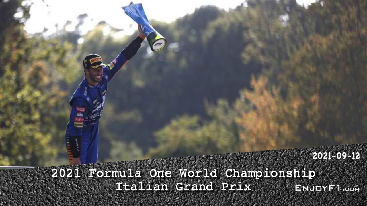 The race was won by McLaren driver Daniel Ricciardo, who capitalised on a good front-row start and an accident between Max Verstappen and Lewis Hamilton to take the race lead. Ricciardo was joined by Lando Norris in second with Mercedes' Valtteri Bottas in third. It was Ricciardo's first victory since the 2018 Monaco Grand Prix, and his last victory as a whole. In addition, the race was McLaren's first Grand Prix victory since Jenson Button's victory at the 2012 Brazilian Grand Prix. This was also McLaren's first 1-2 finish since the 2010 Canadian Grand Prix, and also McLaren's first win at Monza since the 2012 Italian Grand Prix and first double podium since the 2014 Australian Grand Prix.