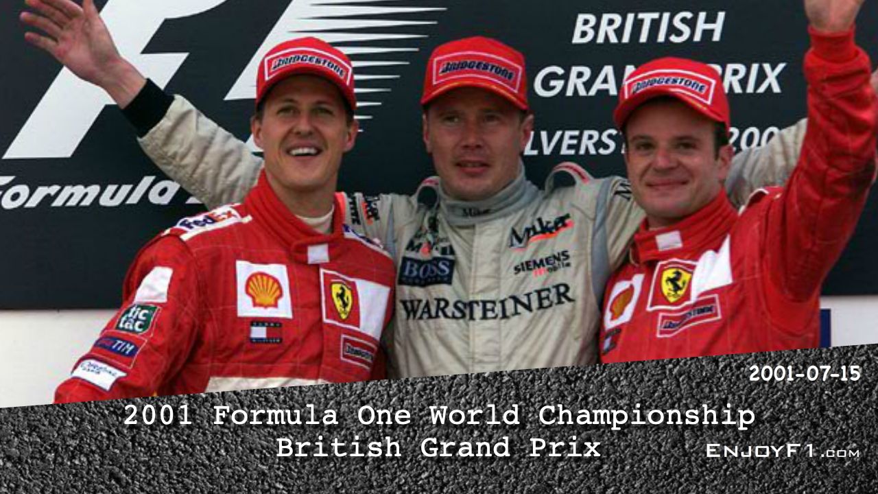 The 2001 British Grand Prix was a Formula One motor race held on 15 July 2001 at the Silverstone Circuit, England. It was the 11th rounds in the 2001 Formula One World Championship. McLaren driver Mika Häkkinen won the race after starting second. The Ferrari duo of Michael Schumacher and Rubens Barrichello finished in second and third, respectively.